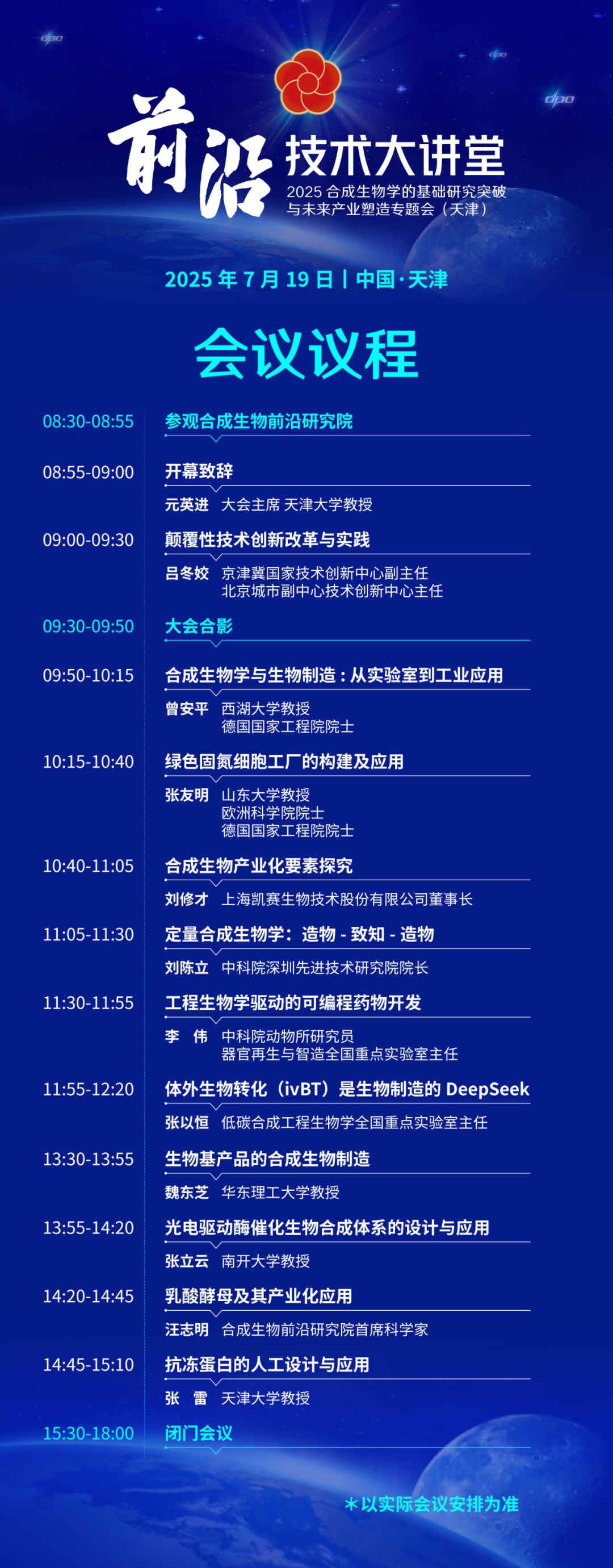 2025 合成生物学的基础研究突破与未来产业塑造专题会(天津)将于2025年7月19日在天津举办,会议聚焦于合成生物学的基础研究突破、关键技术攻关,以及未来产业发展,打破传统化学合成或动物提取的高成本、低纯度瓶颈,攻克量产难的产业化障碍,并以低碳生物制造替代高污染工艺,从而加速技术转化,提升我国合成生物产品的国际竞争力,抢占健康与环保产业的新赛道,进行全面系统的合成生物理论与技术体系的创新应用重塑。特邀合成生物学相关领域的专家学者、企业代表、投资人代表、高校师生等参与!期待您的莅临!